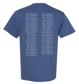 Light Verse design with tour dates on a worker blue Stanley/Stella Creator T-shirt.